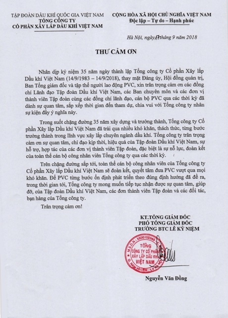 Trong bối cảnh ngành xây lắp dầu khí đang gặp nhiều khó khăn, PVC đã nỗ lực tổ chức Lễ kỷ niệm 35 năm ngày thành lập Tổng công ty và đơn vị thành viên một cách giản dị nhất. Ban lãnh đạo Tổng công ty xin được gửi lời tri ân đến người lao động PVC đã và đang nỗ lực lao động sản xuất, vượt qua khó khăn, vực dậy PVC trong bối cảnh vận hội mới. Trân trọng cảm ơn người lao động PVC. Thay mặt Ban Tổ chức, chúng tôi lấy làm tiếc không thể mời hết toàn thể CBCNV, người lao động PVC đã nghỉ hưu cùng tham dự chương trình. Sau đây là toàn văn lời tri ân của Ban lãnh đạo Tổng công ty.