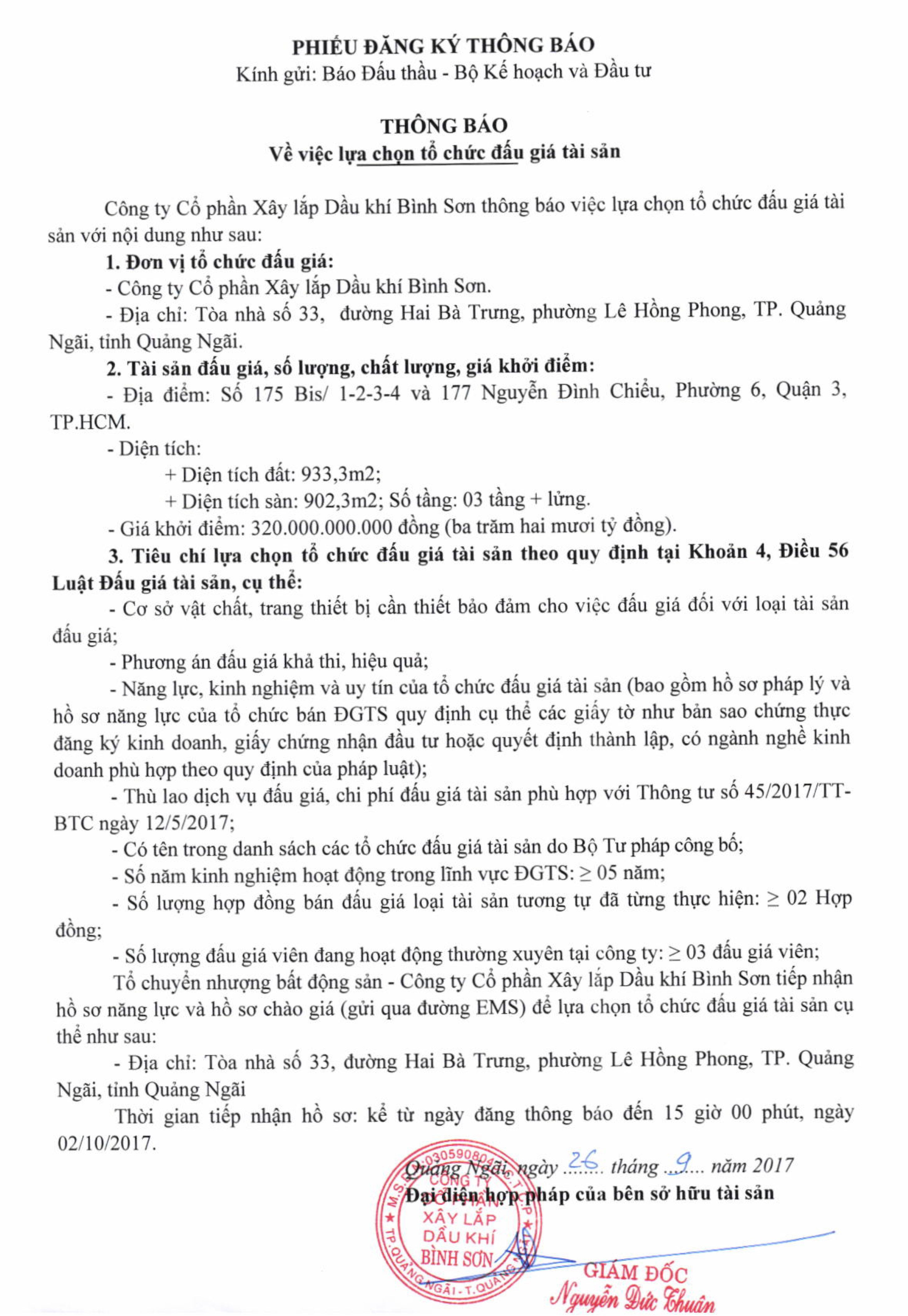 Công ty cổ phần Xây lắp Dầu khí Bình Sơn thông báo việc lựa chọn tổ chức đấu giá tài sản với nội dung như sau: